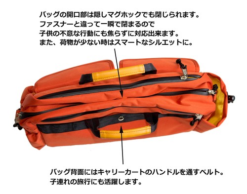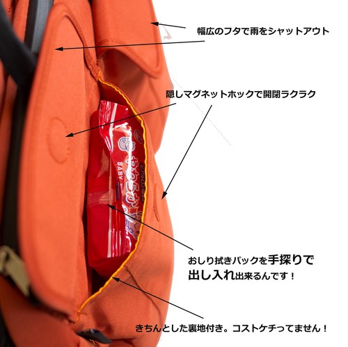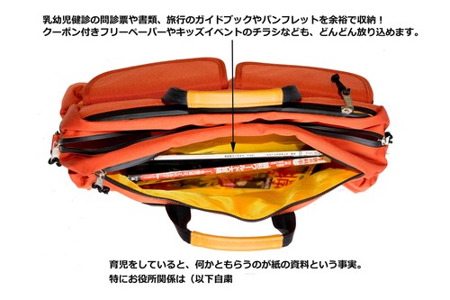 弊社オリジナルの育児バッグです。長男が1歳の誕生日を迎えた春からの毎日の育児を通して得た経験をもとに、最高の機能性と万全の耐久性を持つ育児バッグとしてデザインしました。